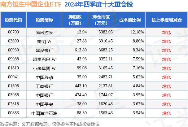 南方恒生中国企业ETF为指数型-股票基金,根据最新一期基金季报显示,该基金资产配置:股票占净值比100.0%,无债券类资产,现金占净值比0.09%。基金十大重仓股如下: