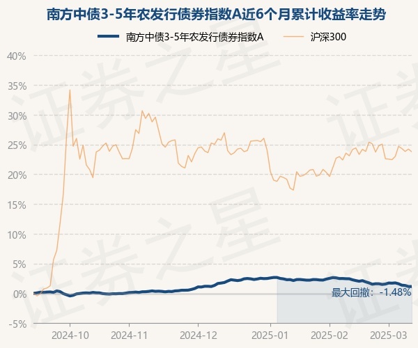 证券之星消息,3月12日,南方中债3-5年农发行债券指数A最新单位净值为1.1002元,累计净值为1.2532元,较前一交易日上涨0.0%。历史数据显示该基金近1个月下跌1.07%,近3个月下跌0.45%,近6个月上涨1.36%,近1年上涨4.57%。该基金近6个月的累计收益率走势如下图: