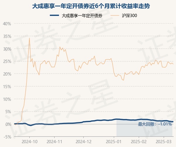 证券之星消息,3月12日,大成惠享一年定开债券最新单位净值为1.0912元,累计净值为1.1423元,较前一交易日上涨0.05%。历史数据显示该基金近1个月下跌0.85%,近3个月下跌0.32%,近6个月上涨0.92%,近1年上涨3.2%。该基金近6个月的累计收益率走势如下图: