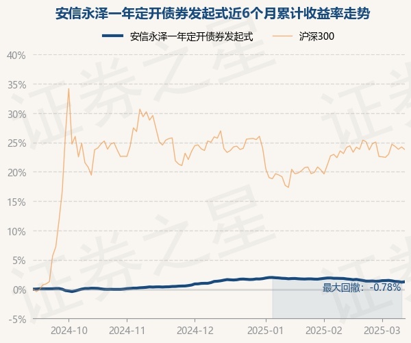 证券之星消息,3月12日,安信永泽一年定开债券发起式最新单位净值为1.0138元,累计净值为1.0438元,较前一交易日上涨0.07%。历史数据显示该基金近1个月下跌0.56%,近3个月下跌0.16%,近6个月上涨1.26%,近1年上涨2.27%。该基金近6个月的累计收益率走势如下图: