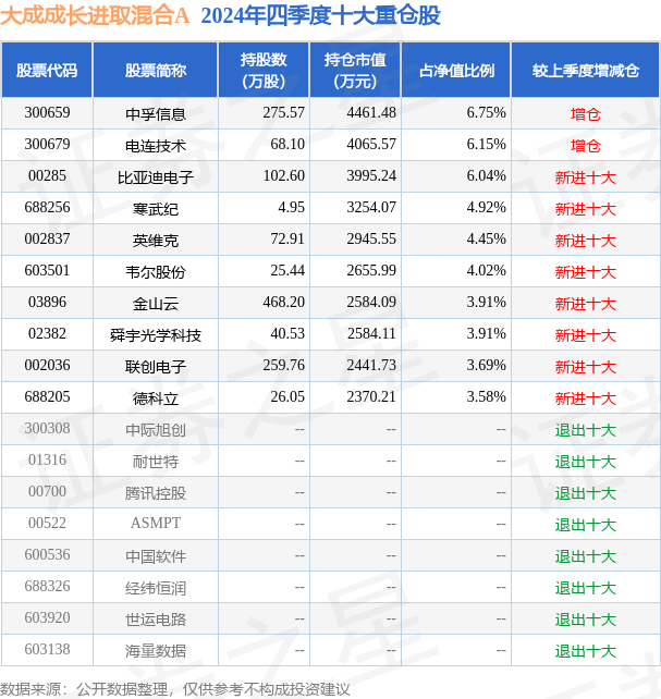 大成成长进取混合A为混合型-偏股基金,根据最新一期基金季报显示,该基金资产配置:股票占净值比86.38%,无债券类资产,现金占净值比12.05%。基金十大重仓股如下: