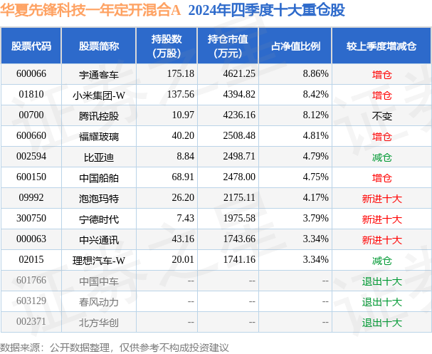 华夏先锋科技一年定开混合A为混合型-偏股基金,根据最新一期基金季报显示,该基金资产配置:股票占净值比93.99%,无债券类资产,现金占净值比6.98%。基金十大重仓股如下: