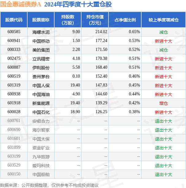 国金惠诚债券A为债券型-混合二级基金,根据最新一期基金季报显示,该基金资产配置:股票占净值比11.84%,债券占净值比104.06%,现金占净值比1.79%。基金十大重仓股如下: