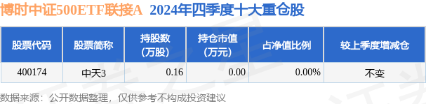 博时中证500ETF联接A为指数型-股票基金,根据最新一期基金季报显示,该基金资产配置:无股票类资产,无债券类资产,现金占净值比6.75%。基金十大重仓股如下:
