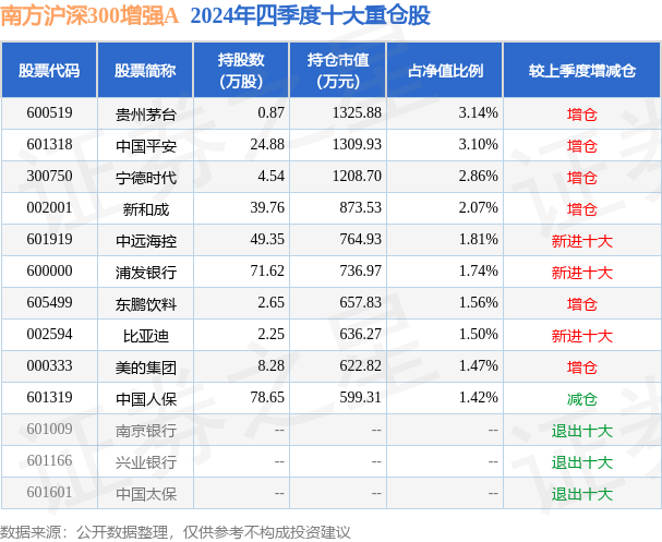 南方沪深300增强A为指数型-股票基金,根据最新一期基金季报显示,该基金资产配置:股票占净值比92.96%,无债券类资产,现金占净值比7.29%。基金十大重仓股如下: