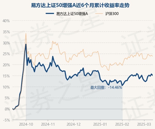 证券之星消息,3月12日,易方达上证50增强A最新单位净值为1.8372元,累计净值为3.8272元,较前一交易日下跌0.52%。历史数据显示该基金近1个月上涨1.12%,近3个月下跌2.81%,近6个月上涨15.13%,近1年上涨3.21%。该基金近6个月的累计收益率走势如下图:
