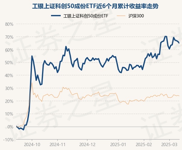 证券之星消息,3月12日,工银上证科创50成份ETF最新单位净值为1.1227元,累计净值为0.7824元,较前一交易日下跌0.73%。历史数据显示该基金近1个月上涨4.87%,近3个月上涨7.96%,近6个月上涨64.98%,近1年上涨33.32%。该基金近6个月的累计收益率走势如下图: