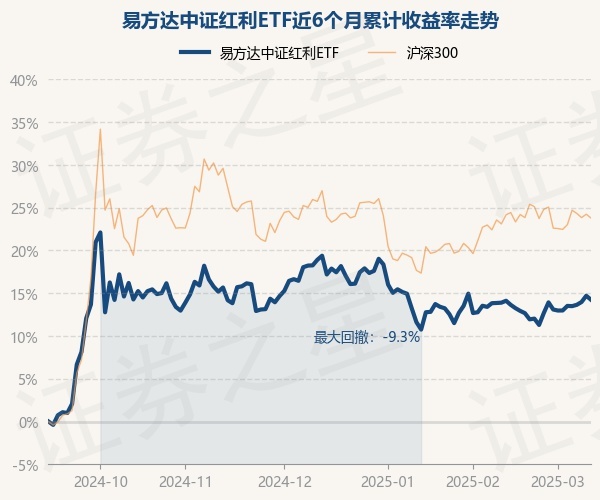 证券之星消息,3月12日,易方达中证红利ETF最新单位净值为1.3303元,累计净值为1.6013元,较前一交易日下跌0.4%。历史数据显示该基金近1个月上涨0.33%,近3个月下跌4.31%,近6个月上涨14.19%,近1年上涨5.12%。该基金近6个月的累计收益率走势如下图: