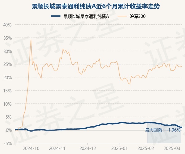 证券之星消息,3月12日,景顺长城景泰通利纯债A最新单位净值为1.0303元,累计净值为1.0527元,较前一交易日上涨0.21%。历史数据显示该基金近1个月下跌1.6%,近3个月下跌0.68%,近6个月上涨1.05%,近1年上涨3.84%。该基金近6个月的累计收益率走势如下图: