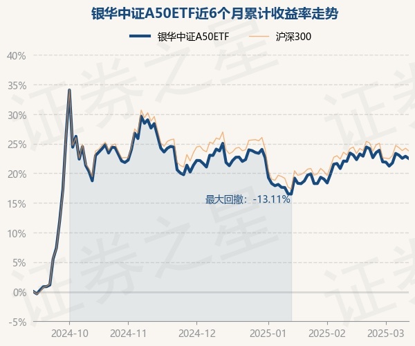 证券之星消息,3月12日,银华中证A50ETF最新单位净值为1.1278元,累计净值为1.1278元,较前一交易日下跌0.31%。历史数据显示该基金近1个月上涨0.35%,近3个月下跌2.05%,近6个月上涨22.49%,近1年上涨12.77%。该基金近6个月的累计收益率走势如下图: