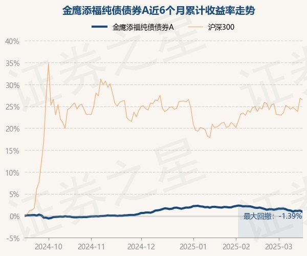 证券之星消息,3月13日,金鹰添福纯债债券A最新单位净值为1.02元,累计净值为1.0578元,较前一交易日下跌0.03%。历史数据显示该基金近1个月下跌1.02%,近3个月下跌0.41%,近6个月上涨1.11%,近1年上涨3.66%。该基金近6个月的累计收益率走势如下图:
