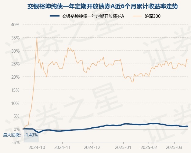 证券之星消息,3月13日,交银裕坤纯债一年定期开放债券A最新单位净值为1.0845元,累计净值为1.1705元,较前一交易日上涨0.08%。历史数据显示该基金近1个月下跌1.06%,近3个月下跌0.25%,近6个月上涨0.99%,近1年上涨2.94%。该基金近6个月的累计收益率走势如下图: