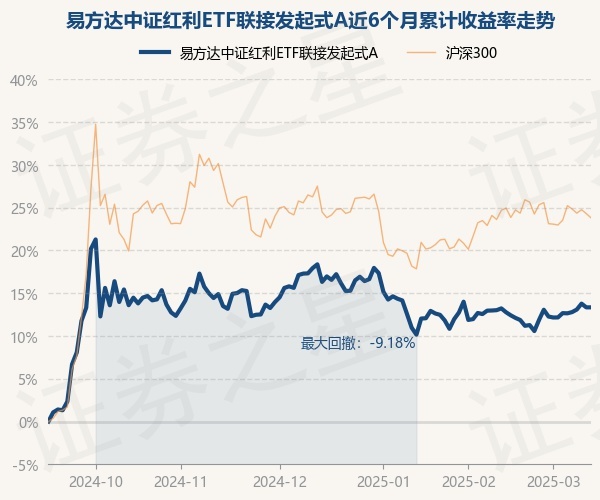 证券之星消息,3月13日,易方达中证红利ETF联接发起式A最新单位净值为1.2116元,累计净值为1.4116元,较前一交易日上涨0.0%。历史数据显示该基金近1个月上涨0.96%,近3个月下跌1.91%,近6个月上涨14.18%,近1年上涨5.57%。该基金近6个月的累计收益率走势如下图: