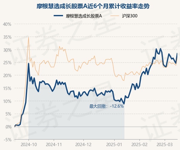 证券之星消息,3月13日,摩根慧选成长股票A最新单位净值为1.2543元,累计净值为1.2543元,较前一交易日下跌0.74%。历史数据显示该基金近1个月上涨3.66%,近3个月上涨10.15%,近6个月上涨24.62%,近1年上涨19.65%。该基金近6个月的累计收益率走势如下图:
