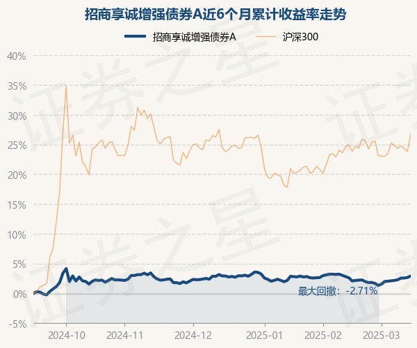 证券之星消息,3月13日,招商享诚增强债券A最新单位净值为1.109元,累计净值为1.109元,较前一交易日上涨0.09%。历史数据显示该基金近1个月下跌0.34%,近3个月下跌0.26%,近6个月上涨2.67%,近1年上涨4.59%。该基金近6个月的累计收益率走势如下图:
