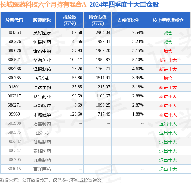 长城医药科技六个月持有混合A为混合型-偏股基金,根据最新一期基金季报显示,该基金资产配置:股票占净值比86.27%,无债券类资产,现金占净值比16.01%。基金十大重仓股如下: