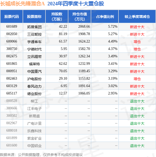 长城成长先锋混合A为混合型-偏股基金,根据最新一期基金季报显示,该基金资产配置:股票占净值比83.89%,无债券类资产,现金占净值比14.58%。基金十大重仓股如下: