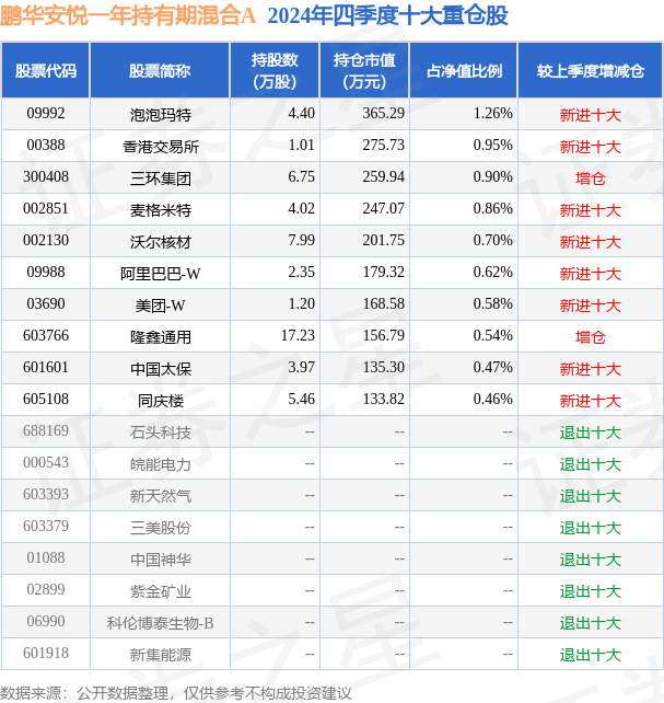 鹏华安悦一年持有期混合A为混合型-偏债基金,根据最新一期基金季报显示,该基金资产配置:股票占净值比17.94%,债券占净值比103.82%,现金占净值比3.03%。基金十大重仓股如下: