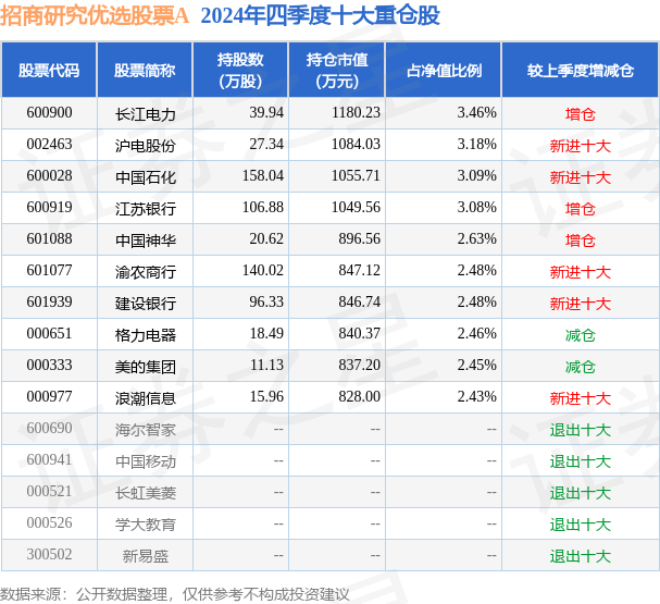 招商研究优选股票A为股票型基金,根据最新一期基金季报显示,该基金资产配置:股票占净值比81.86%,无债券类资产,现金占净值比14.08%。基金十大重仓股如下: