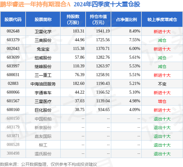 鹏华睿进一年持有期混合A为混合型-偏股基金,根据最新一期基金季报显示,该基金资产配置:股票占净值比94.67%,无债券类资产,现金占净值比7.31%。基金十大重仓股如下: