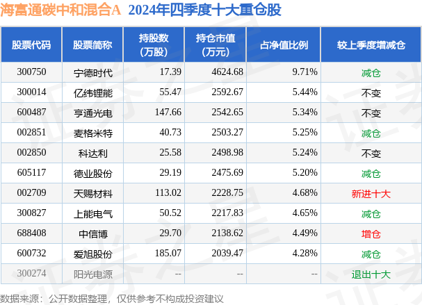 海富通碳中和混合A为混合型-偏股基金,根据最新一期基金季报显示,该基金资产配置:股票占净值比92.98%,无债券类资产,现金占净值比7.49%。基金十大重仓股如下: