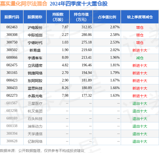 嘉实量化阿尔法混合为混合型-偏股基金,根据最新一期基金季报显示,该基金资产配置:股票占净值比93.82%,无债券类资产,现金占净值比6.49%。基金十大重仓股如下: