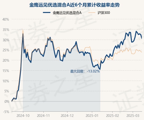 证券之星消息,3月13日,金鹰远见优选混合A最新单位净值为0.8738元,累计净值为0.8738元,较前一交易日下跌1.37%。历史数据显示该基金近1个月上涨3.78%,近3个月上涨3.51%,近6个月上涨30.63%,近1年上涨14.51%。该基金近6个月的累计收益率走势如下图: