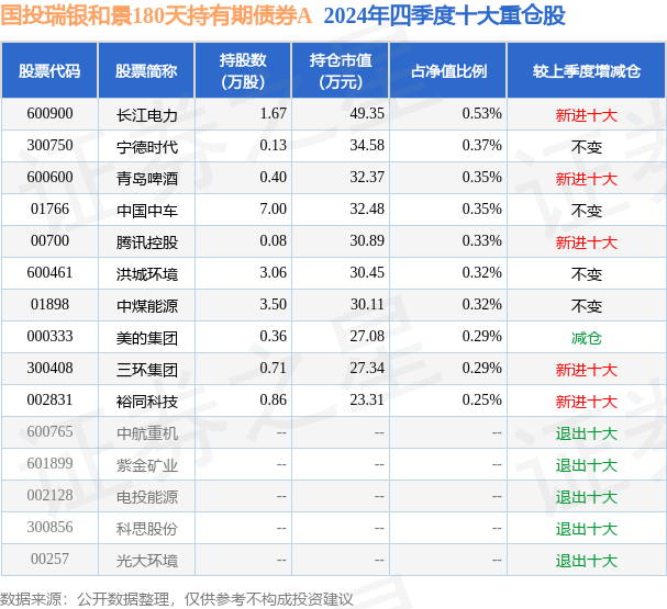 国投瑞银和景180天持有期债券A为债券型-混合二级基金,根据最新一期基金季报显示,该基金资产配置:股票占净值比5.53%,债券占净值比93.66%,现金占净值比13.17%。基金十大重仓股如下: