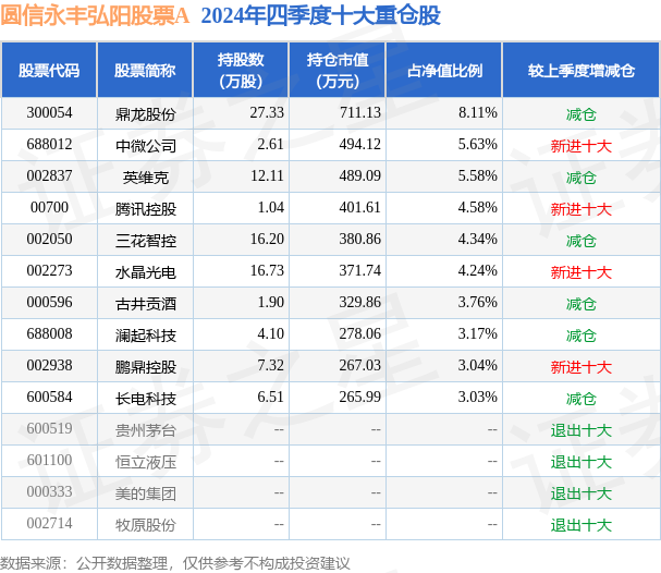 圆信永丰弘阳股票A为股票型基金,根据最新一期基金季报显示,该基金资产配置:股票占净值比93.61%,债券占净值比5.69%,现金占净值比1.32%。基金十大重仓股如下: