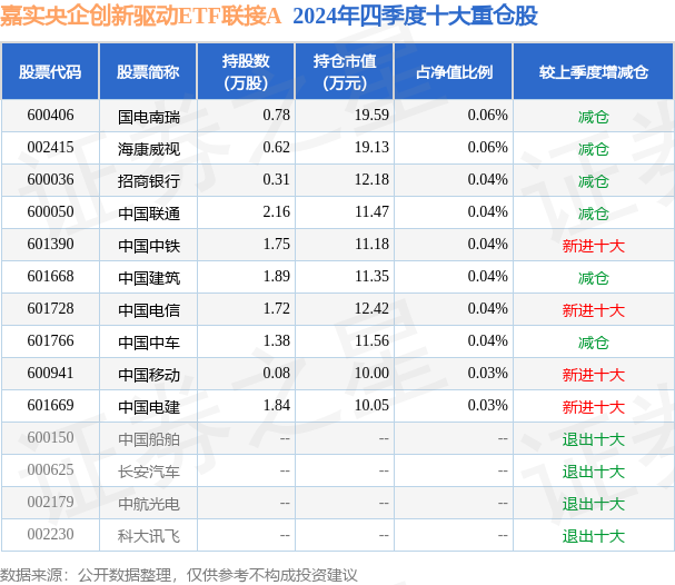 嘉实央企创新驱动ETF联接A为指数型-股票基金,根据最新一期基金季报显示,该基金资产配置:股票占净值比1.21%,无债券类资产,现金占净值比5.61%。基金十大重仓股如下: