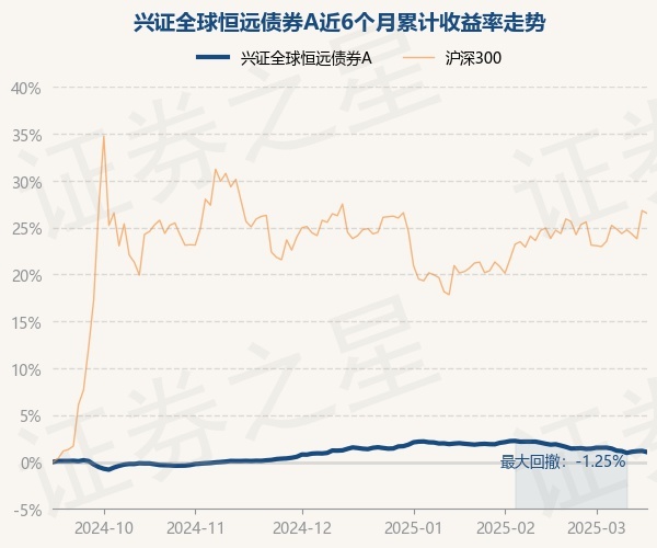 证券之星消息,3月13日,兴证全球恒远债券A最新单位净值为1.0455元,累计净值为1.0655元,较前一交易日上涨0.07%。历史数据显示该基金近1个月下跌0.99%,近3个月下跌0.25%,近6个月上涨1.15%,近1年上涨3.69%。该基金近6个月的累计收益率走势如下图: