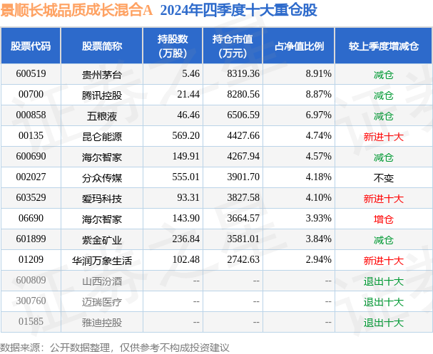 景顺长城品质成长混合A为混合型-偏股基金,根据最新一期基金季报显示,该基金资产配置:股票占净值比91.99%,债券占净值比3.24%,现金占净值比5.4%。基金十大重仓股如下: