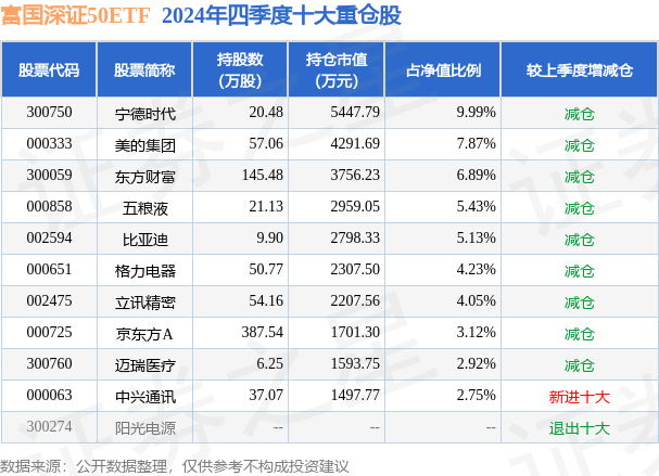 富国深证50ETF为指数型-股票基金,根据最新一期基金季报显示,该基金资产配置:股票占净值比99.82%,无债券类资产,现金占净值比0.53%。基金十大重仓股如下: