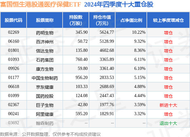 富国恒生港股通医疗保健ETF为指数型-股票基金,根据最新一期基金季报显示,该基金资产配置:股票占净值比99.25%,无债券类资产,现金占净值比0.17%。基金十大重仓股如下: