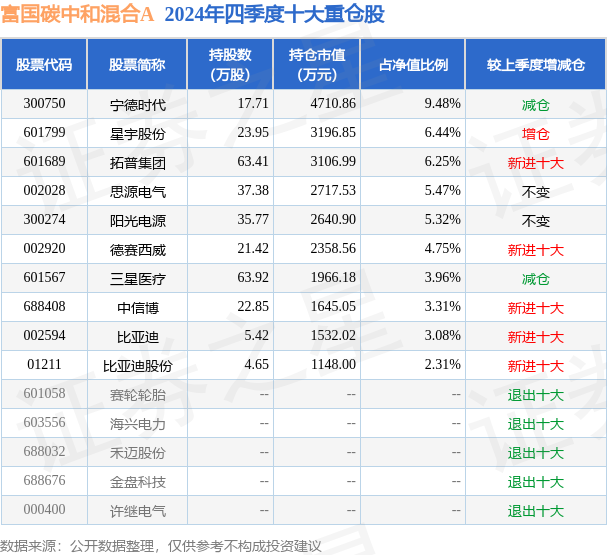 富国碳中和混合A为混合型-偏股基金,根据最新一期基金季报显示,该基金资产配置:股票占净值比92.15%,债券占净值比0.08%,现金占净值比7.95%。基金十大重仓股如下: