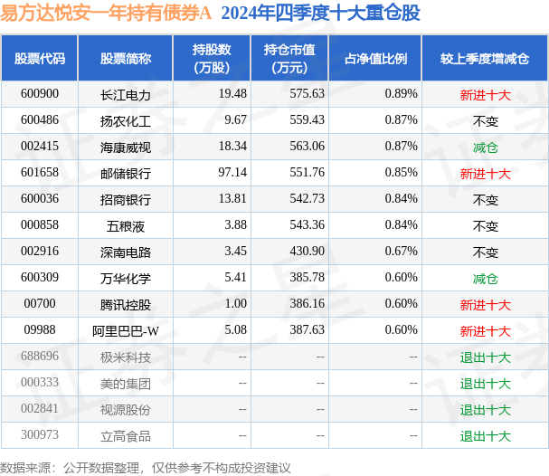 易方达悦安一年持有债券A为债券型-混合二级基金,根据最新一期基金季报显示,该基金资产配置:股票占净值比10.79%,债券占净值比114.42%,现金占净值比3.1%。基金十大重仓股如下: