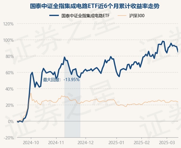 证券之星消息,3月13日,国泰中证全指集成电路ETF最新单位净值为1.4044元,累计净值为1.4044元,较前一交易日下跌3.26%。历史数据显示该基金近1个月上涨2.98%,近3个月上涨13.11%,近6个月上涨85.25%,近1年上涨53.81%。该基金近6个月的累计收益率走势如下图: