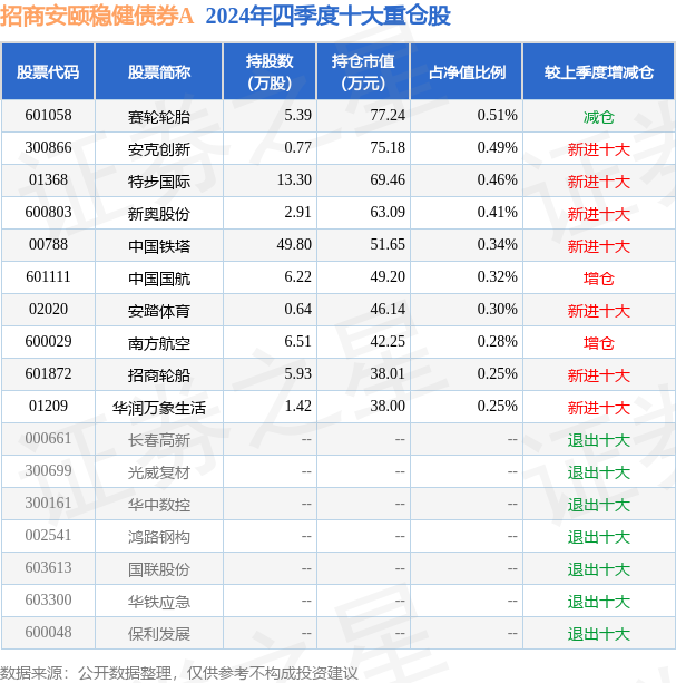 招商安颐稳健债券A为债券型-混合二级基金,根据最新一期基金季报显示,该基金资产配置:股票占净值比4.54%,债券占净值比85.76%,现金占净值比1.59%。基金十大重仓股如下: