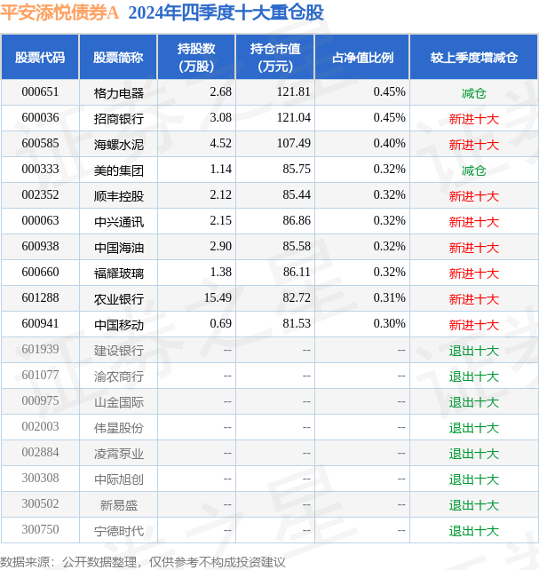 平安添悦债券A为债券型-混合二级基金,根据最新一期基金季报显示,该基金资产配置:股票占净值比17.83%,债券占净值比80.48%,现金占净值比1.26%。基金十大重仓股如下: