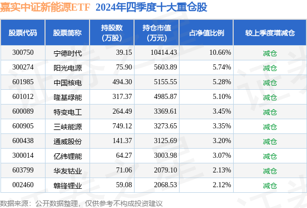 嘉实中证新能源ETF为指数型-股票基金,根据最新一期基金季报显示,该基金资产配置:股票占净值比99.64%,无债券类资产,现金占净值比0.64%。基金十大重仓股如下: