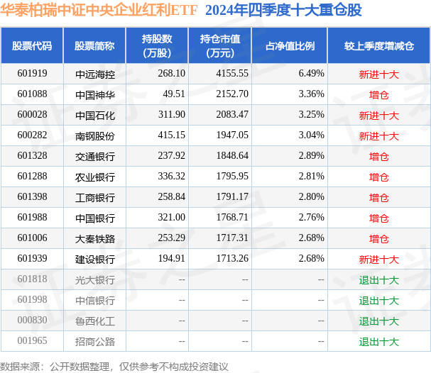 华泰柏瑞中证中央企业红利ETF为指数型-股票基金,根据最新一期基金季报显示,该基金资产配置:股票占净值比99.27%,无债券类资产,现金占净值比0.83%。基金十大重仓股如下: