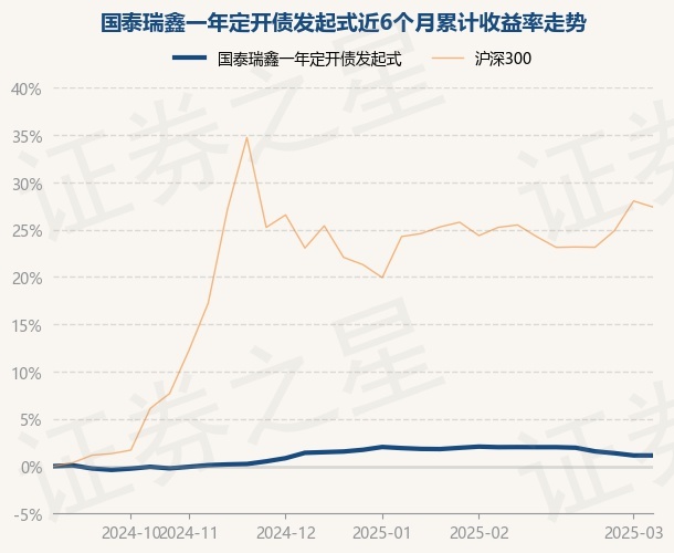 证券之星消息,3月14日,国泰瑞鑫一年定开债发起式最新单位净值为1.0523元,累计净值为1.1082元,较前一交易日上涨0.0%。历史数据显示该基金近1个月下跌0.8%,近3个月下跌0.27%,近6个月上涨1.13%,近1年上涨3.15%。该基金近6个月的累计收益率走势如下图: