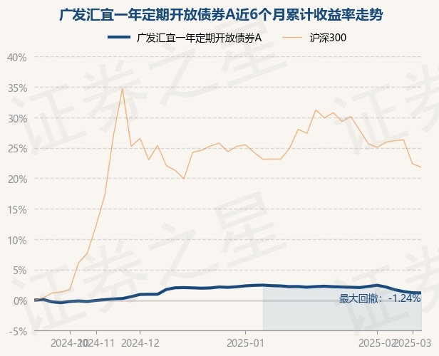 证券之星消息,3月14日,广发汇宜一年定期开放债券A最新单位净值为1.0169元,累计净值为1.1211元,较前一交易日下跌0.03%。历史数据显示该基金近1个月下跌0.94%,近3个月下跌0.56%,近6个月上涨1.19%,近1年上涨4.28%。该基金近6个月的累计收益率走势如下图:
