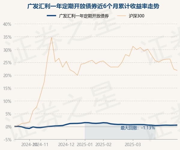 证券之星消息,3月14日,广发汇利一年定期开放债券最新单位净值为1.0247元,累计净值为1.2079元,较前一交易日上涨0.04%。历史数据显示该基金近1个月下跌0.87%,近3个月下跌0.62%,近6个月上涨0.5%,近1年上涨2.68%。该基金近6个月的累计收益率走势如下图: