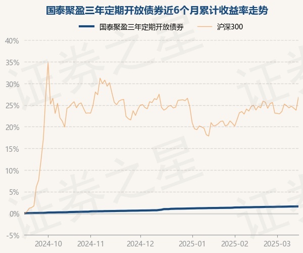证券之星消息,3月14日,国泰聚盈三年定期开放债券最新单位净值为1.0063元,累计净值为1.1328元,较前一交易日上涨0.01%。历史数据显示该基金近1个月上涨0.19%,近3个月上涨0.76%,近6个月上涨1.59%,近1年上涨2.83%。该基金近6个月的累计收益率走势如下图: