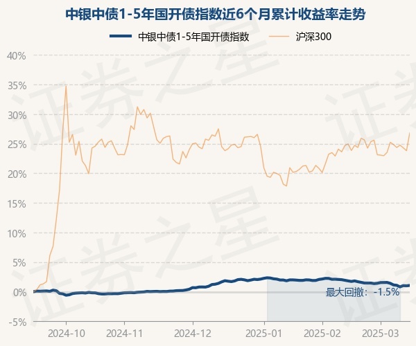 证券之星消息,3月14日,中银中债1-5年国开债指数最新单位净值为1.0805元,累计净值为1.1475元,较前一交易日上涨0.06%。历史数据显示该基金近1个月下跌0.85%,近3个月下跌0.59%,近6个月上涨1.06%,近1年上涨3.99%。该基金近6个月的累计收益率走势如下图: