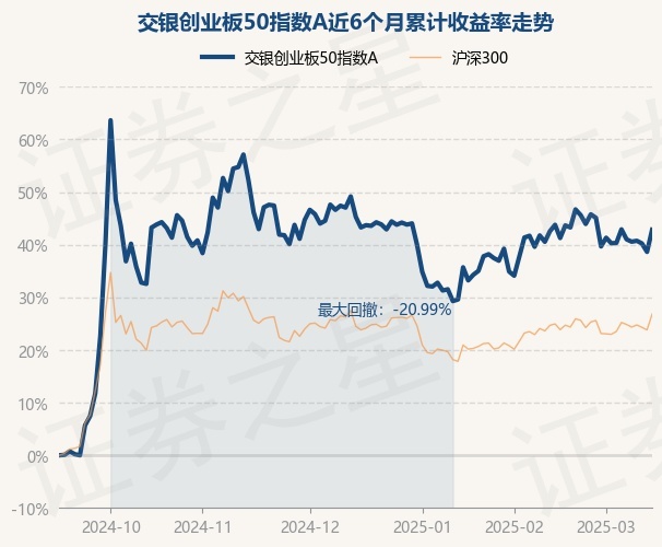 证券之星消息,3月14日,交银创业板50指数A最新单位净值为1.3842元,累计净值为1.5212元,较前一交易日上涨3.03%。历史数据显示该基金近1个月上涨0.19%,近3个月下跌1.65%,近6个月上涨42.65%,近1年上涨20.74%。该基金近6个月的累计收益率走势如下图: