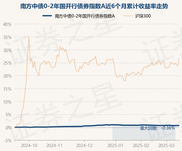 证券之星消息,3月14日,南方中债0-2年国开行债券指数A最新单位净值为1.0249元,累计净值为1.1199元,较前一交易日上涨0.02%。历史数据显示该基金近1个月下跌0.12%,近3个月下跌0.08%,近6个月上涨0.69%,近1年上涨2.07%。该基金近6个月的累计收益率走势如下图: