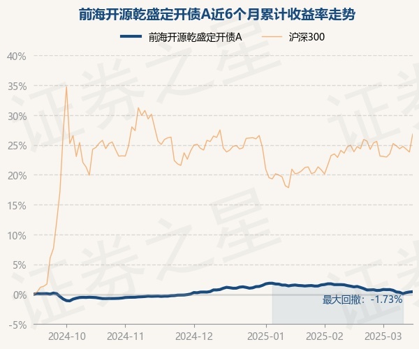 证券之星消息,3月14日,前海开源乾盛定开债A最新单位净值为1.0368元,累计净值为1.269元,较前一交易日上涨0.05%。历史数据显示该基金近1个月下跌1.01%,近3个月下跌0.58%,近6个月上涨0.41%,近1年上涨3.25%。该基金近6个月的累计收益率走势如下图: