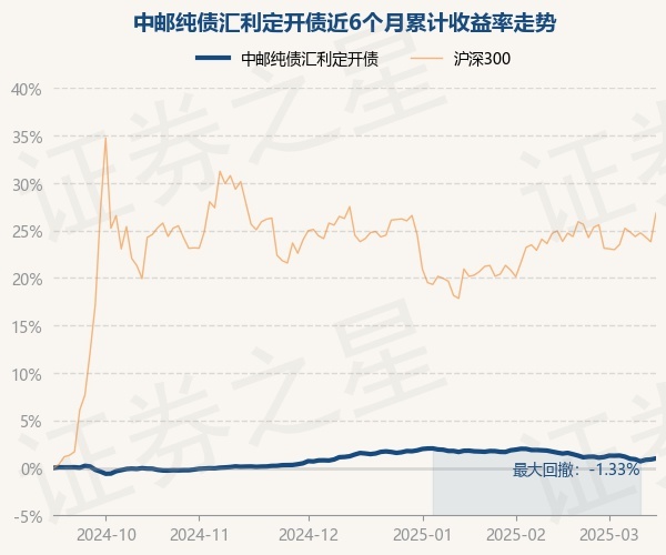 证券之星消息,3月14日,中邮纯债汇利定开债最新单位净值为1.025元,累计净值为1.2307元,较前一交易日上涨0.11%。历史数据显示该基金近1个月下跌0.71%,近3个月下跌0.41%,近6个月上涨0.99%,近1年上涨3.69%。该基金近6个月的累计收益率走势如下图: